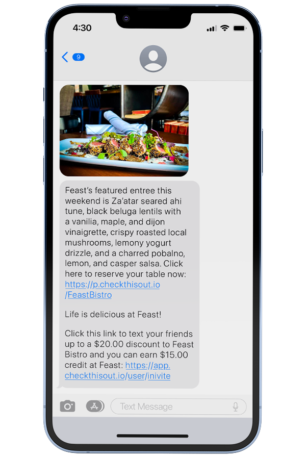 Weekly special text campaigns are great for showcasing a featured entree. Instead of announcing specials to guests already sitting in your restaurant, why not broadcast your delicious new dish to 1000s of your diners via text? They help drive traffic with new and loyal guests who are excited to see your latest fares. Your guests can reserve a table directly from the text and get a discount for referring a friend!